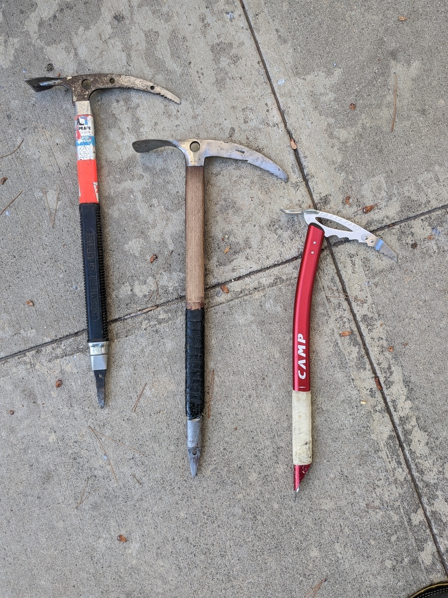 ピッケルの重要な役目は登高の補助と滑落の停止です。大昔は足場を刻んだりするのに多用したので長い方が便利でした。ツルハシのように両手で持って氷の斜面にステップを刻んでいきました。滑落停止の作業や下降時にも長い方が使いやすいのは事実です。反対に積極的に登高の手段に使う急斜面では明らかに短い方が有効です。長いと取り回しがたいへんで不便になります。